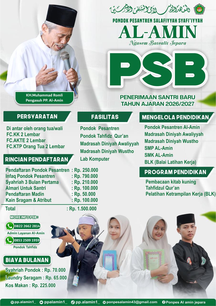 Selamat datang di portal PSB Pondok Pesantren Salafiyyah Syafi’iyyah Al-Amin Ngasem Batealit Jepara. Kami membuka pendaftaran untuk santri baru jenjang SMP, SMK, dan Madrasah Diniyah.
